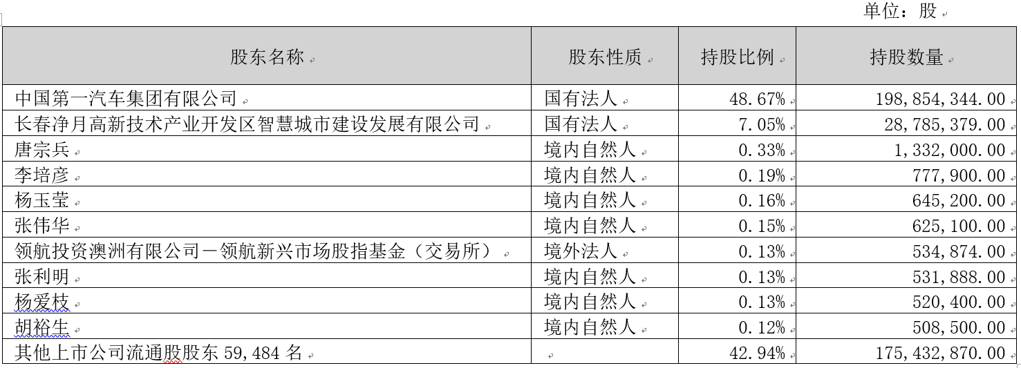 启明信息技术股份有限公司(以下简称“公司”)2008年5月9日在深圳证券交易所挂牌上市,股票简称“启明信息”,股票代码为:002232,目前为深交所主板上市公司。截至2022年9月30日,公司共有股东59,494名,公司控股股东及实际控制人为中国第一汽车集团有限公司,具体股权结构如下表: